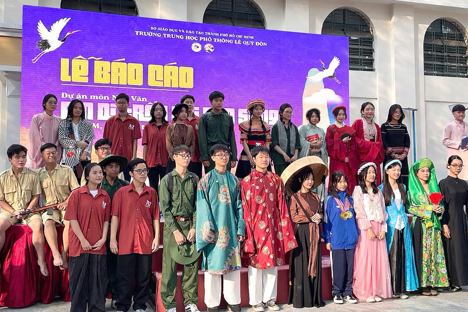 Các bạn học sinh hóa thân thành 14 nhân vật phụ nữ tiêu biểu qua các thời kỳ - Ảnh: HỒ NHƯỠNG