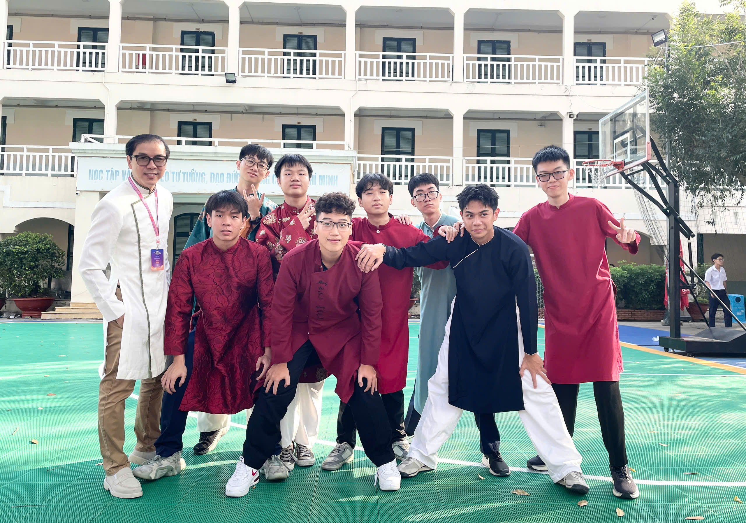 Thầy Trương Minh Đức - giáo viên môn ngữ văn - và các bạn học sinh hào hứng trong những bộ Việt phục - Ảnh: HỒ NHƯỠNG