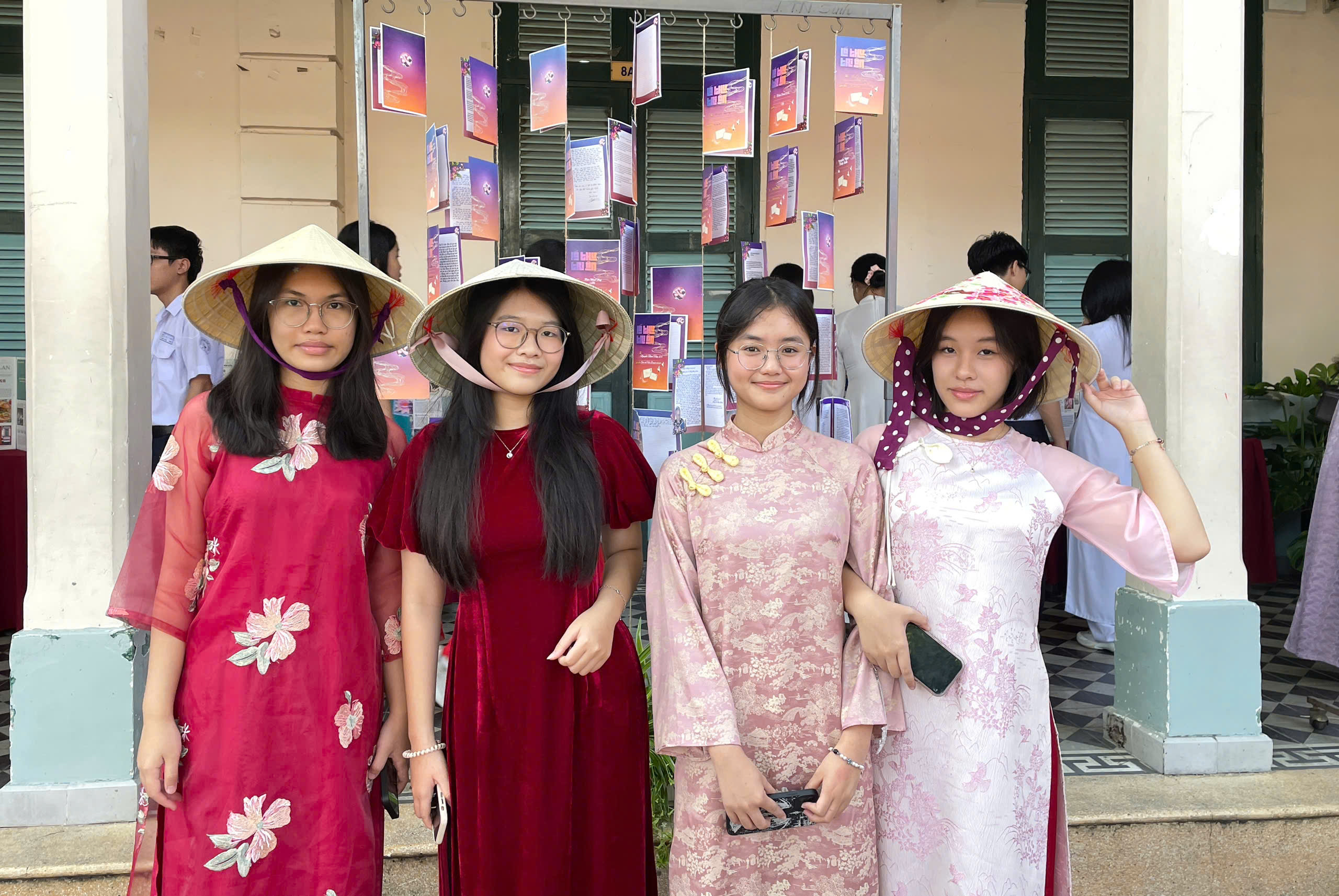 Bạn Bảo Hân (thứ hai từ trái sang) và các bạn thích thú trong những bộ áo dài - Ảnh: HỒ NHƯỠNG