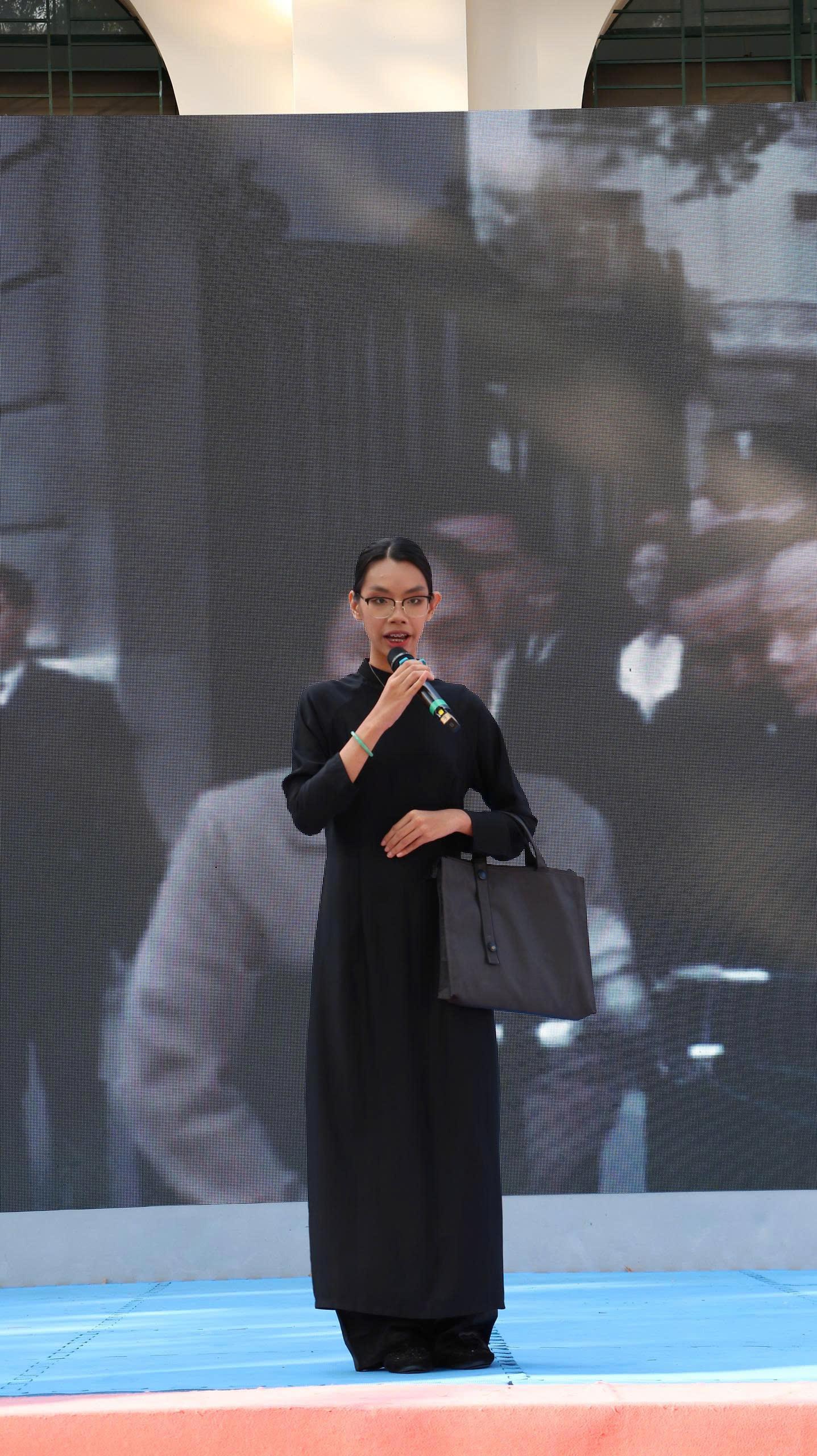 Hóa thân thành Madame Nguyễn Thị Bình, em Khánh Phúc, học sinh lớp 11A13, chia sẻ em đã dành cả tuần nghiên cứu tư liệu, xem video, học từng dáng đi, ánh mắt, cử chỉ của bà.